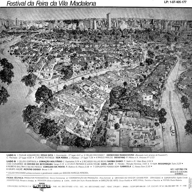 Originalmente denominada Vila dos Farrapos, a Vila Madalena é um bairro nobre da cidade de São Paulo, situado no subdistrito de Pinheiros. Ficou bastante conhecida por ser um reduto boêmio da capital paulista, desde o início dos anos 1970, quando estudantes de pouco dinheiro passaram a ali residir, por causa da proximidade à Universidade de São Paulo (USP) e à Pontifícia Universidade Católica (PUC).  Na Vila Madalena, concentram-se inúmeros bares e casas noturnas, e lá também fica a Escola de Samba Pérola Negra. Há também ateliês, centros de exposições artísticas, lojas de vanguarda e escolas de música e teatro. O bairro até virou telenovela, exibida pela Globo no final dos anos 1990. A associação de moradores da Vila Madalena organiza feiras para mostrar os talentos artísticos do bairro, e um festival anual, conhecido como Feira da Vila, que atrai gente de toda São Paulo, com shows e barracas de artesanato. Sua primeira edição aconteceu em 1977, na Rua Girassol, e o evento já faz parte do calendário  oficial da capital paulista. Sendo assim, o Toque Musical prossegue seu ciclo dedicado aos festivais oferecendo a seus amigos cultos, ocultos e associados um álbum raro. O disco põe em foco a edição de 1980 do Festival da Feira da Vila Madalena, e foi lançado em 1980 pela Continental.  No repertório, estão doze das concorrentes do certame, inclusive a vencedora, “Tem Maria”, composta e interpretada por  Jorge Matheus. A vice-campeã foi “Improviso nordestino”, de e com Celso Machado, baseada em um arranjo do clássico “Juazeiro”, de Luiz Gonzaga e Humberto Teixeira.  A terceira colocada, e que por certo ficou mais conhecida, foi “Nêgo Dito” (“Meu nome é Nêgo Dito João dos Santos Silva Beleleu”…), composta e interpretada por Itamar Assumpção (Tietê, SP, 13/9/1949-São Paulo, 12/6/2003), um dos ícones da música de vanguarda paulistana. Houve ainda menção honrosa para “Cool jazz”, de Cacá Mendes, com ele e Lúcia Nagib. Merece também destaque as participações de Celito Espíndola, irmão das cantoras Tetê e Alzira Espíndola, interpretando seu “Coração solitário”, e do futuro integrante da banda de rock Titãs, Paulo Miklos, com “Desenho”, feita por ele em parceria com Arnaldo Antunes, que seria a figura de proa do grupo em seus primeiros anos. Em suma, um álbum que documenta o que foi o Festival da Feira Livre da Vila Madalena de 1980, e com o qual o TM também homenageia esse bairro que vem se destacando como importante reduto sócio-cultural da capital paulista. É só conferir.