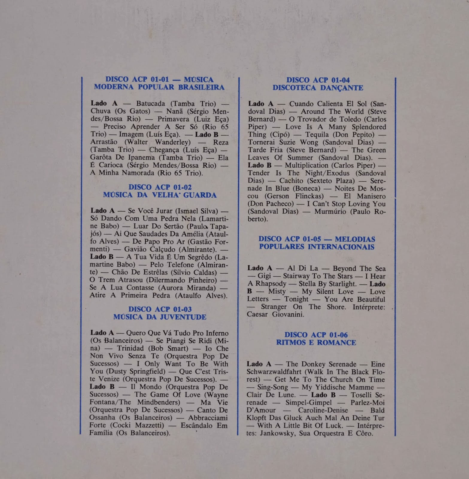 Começamos então com “Música Moderna Popular Brasileira”, que é o volume 1. Neste disco iremos encontrar alguns genuínos representantes do que era o moderno até então, a Bossa Nova. Artistas e músicas memoráveis, verdadeiros clássicos da nossa MPB. As músicas foram extraídas de diferentes álbuns, mas todos da mesma gravadora CBD/Philips. Vamos lá…