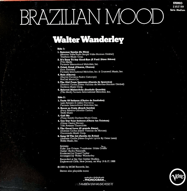 Olá amigos cultos e ocultos! Saímos do fogo e caímos no gelo, ou vice-versa… Em outras palavras, saímos do legítimo brega, do Waldik e vamos para o sofisticado, do Walter Wanderley em sua fase no prestigiado selo americano, Verve. onde ‘o buraco é mais em baixo’, música de qualidade. Este lp foi produzido pelo lendário (e ainda vivo, creio eu) Creed Taylor, um cara muito ‘antenado’ com a música brasileira dos anos 60, em especial a Bossa Nova. Através de seu selo CTI passaram Antonio Carlos Jobim, Sérgio Mendes, Deodato, Astrud Gilbert e outros.. Waler Wanderley também estaria neste selo após gravar o “Brazilian Mood”, Eis aí um disco dos mais bacanas do organista brasileiro que aqui nos traz um repertório essencialmente de bossa. Um disco para se ouvir de cabo a rabo.