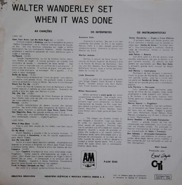 Para começarmos bem a semana, aqui vai mais um disco bacana do Walter Wanderley, em sua fase internacional. Temos aqui “When It Was Done”, álbum lançado em 1968 pelo produtor Creed Taylor. Realmente um discaço onde WW conta com o apoio de uma turma de primeiríssima. Começando pelos vocais de Anamaria Valle, Milton Nascimento e as americanas Marilyn Jackson e Linda November. O grupo de músicos que acompanham o Walter é João Palma na bateria, José Marina no contrabaixo, Lulu Ferreira na percussão e o americano Marvin Stamm no ‘fluglhorn’. Contam que Marcos Valle também participou das gravações, mas no disco não consta os créditos. Os arranjos são de Eumir Deodato e Don Sebesky. O repertório é uma bem dosada mistura de música brasileira e americana, como vocês mesmos podem verificar na listagem a baixo. Taí um disco recomendadíssimo…