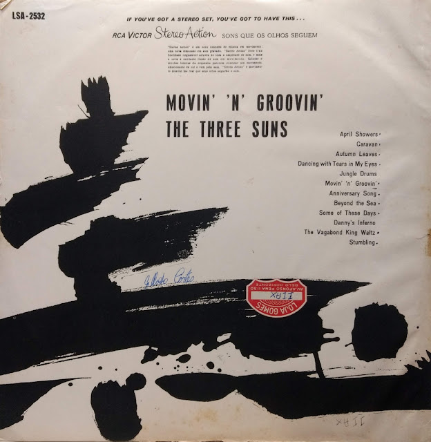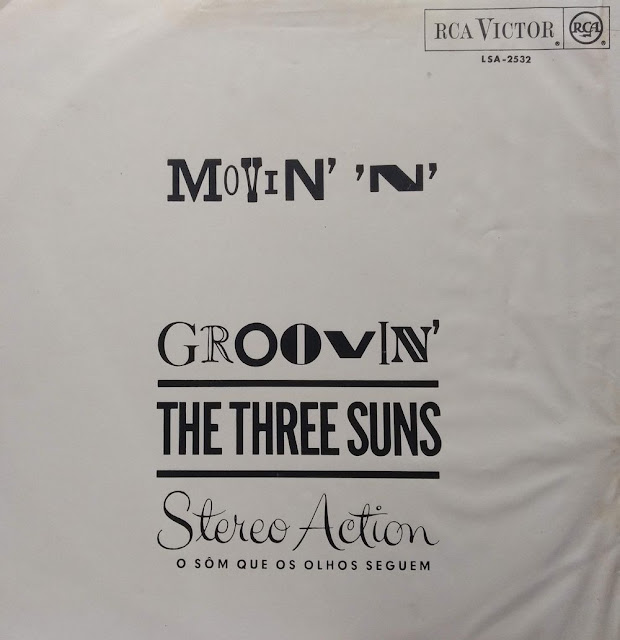 Olá, amigos cultos e ocultos! Aqui vai mais um lp internacional, lançado no Brasil, possivelmente, por volta de 1963, pelo selo RCA Victor. Uma garantia de qualidade, com certeza! Mas, para além da qualidade técnica, temos aqui um curioso e excelente grupo chamado The Three Suns. Formado no final dos anos 30 pelos irmãos Al Nevins (guitarra) e Morty Nevins (acordeom) e o primo Artie Dunn (vocal e orgão). O The Three Suns foram muito populares nos anos 40 e 50. Se destacaram pela peculiaridade musical, com efeitos sonoros e arranjos que mais lembravam trilhas para filmes. Aliás, eles fizeram alguns filmes, os percursores do vídeo clip, para aquelas máquinas, tipo junkeboxes, onde se colocava uma moeda e podia assistir o filminho. Uma atração para a época. Um de seus hits mais famosos é “Twilight Time”, numa versão ainda instrumental. O trio durou até os anos 50, quando então surgiu o rock’n’roll. A partir daí eles começaram a fazer uma música ainda mais interessante, usando também de outros instrumentos. Aproveitando a inovação do hi-fi e do estéreo, eles compuseram arranjos elaborados e lançaram discos como este Movin’N’Groovin’, que foi lançado lá fora em 1962. Aqui no Brasil deve ter chegado um ano depois ou mais. Um disco delicioso de se ouvir. Tenho certeza de que se ouvirem, irão gostar 😉