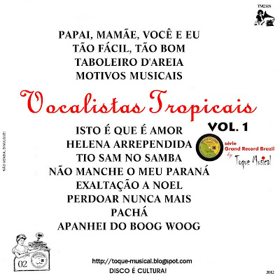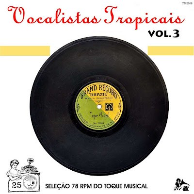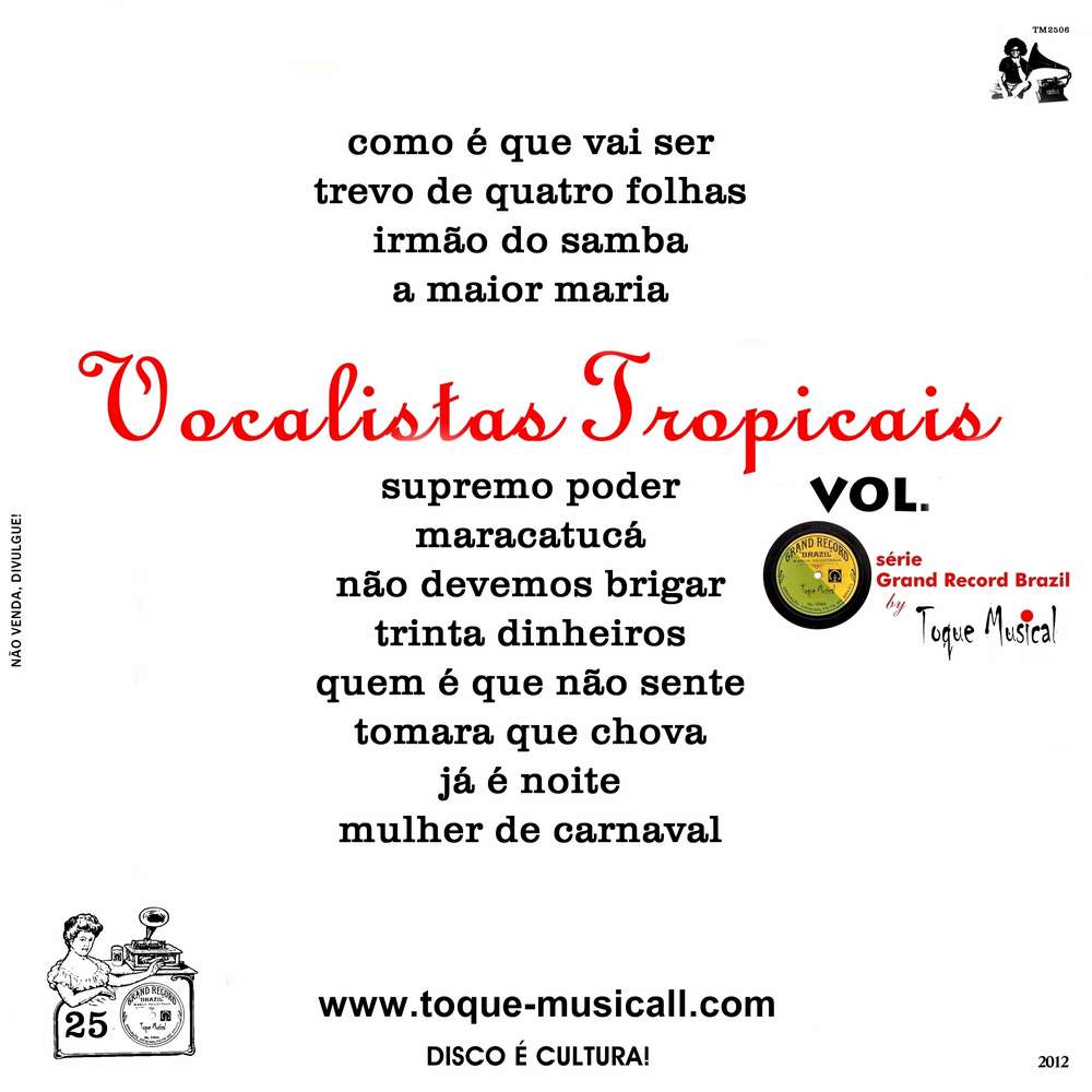 E eis aqui a terceira edição (no geral, a de número 25) que o meu, o seu, o nosso Grand Record Brazil dedica a este grande conjunto vocal-instrumental que foram os Vocalistas Tropicais. Mais doze fonogramas raros que certamente irão parar nos arquivos de muitos colecionadores. Continuando nossa retrospectiva, ainda com originais Odeon, abrimos esta terceira parte com o samba “Como é que vai ser?”, de Marino Pinto e Mário Rossi, dupla respeitável da MPB, gravado em 3 de setembro de 1948 com lançamento em novembro seguinte sob número 12883-B, matriz 8410 (o outro lado de “Ester”, de nossa edição anterior). Em seguida, uma versão bastante conhecida: “Trevo de quatro folhas (I’m looking over a four leaf clover)”, de Harry Woods e Mort Dixon, fox composto em 1927 e sucesso na voz de Al Jolson, cantor americano que costumava pintar o rosto de preto, interpretado por Larry Parks em dois filmes da Columbia: “Sonhos dourados” e “O trovador inolvidável”, sendo a música reapresentada neste último. Nilo Sérgio fez a letra brasileira e a gravou na Continental em 1949, com grande sucesso. Logo em seguida, em 13 de maio desse ano, os Vocalistas Tropicais fizeram nosso registro desta edição, lançado pela “marca do templo” em julho seguinte com o número 12934-A, matriz 8493. No verso, matriz 8492, a faixa seguinte, “Irmão do samba”, de Nestor de Holanda (também escritor e jornalista, pernambucano de Vitória de Santo Antão) e Jorge Tavares. Eles também foram parceiros, vale ressaltar, no samba-canção “Quem foi?”, gravado por Aracy de Almeida exatamente com os Vocalistas Tropicais junto. A quarta faixa, que até eu queria ter na coleção, é o samba “A maior Maria”, de Waldemar Ressurreição e Gerôncio Cardoso, lado B do disco de “Minha terra”, de nossa edição anterior, o Odeon 12952, gravado em primeiro de agosto de 1949 e lançado em outubro seguinte, matriz 8540. Temos depois outro samba, agora para o carnaval de 1950: “Supremo poder”, de Fernando Martins e Victor Simon (este último autor dos clássicos “Bom dia, café” e “O vagabundo”), gravado pelos Vocalistas em 4 de novembro de 1949 e lançado um mês antes da folia, em janeiro, com o número 12979-B, matriz 8580 (é o verso de “Ela é falsa”, de nossa edição anterior). A faixa seguinte é o maracatu “Maracatucá”, de Geraldo Medeiros e Jorge Tavares. É o lado B do disco em que saiu a versão “Bebê (Baby face)”, apresentada em nossa edição anterior, o Odeon 12989, gravado em 16 de dezembro de 1949 e lançado bem depois do carnaval de 50, em março, matriz 8608. Depois tem o samba “Não devemos mais brigar”, do cantor Gilberto Milfont em parceria com Mílton de Oliveira, lado B do disco de outra faixa de nossa edição anterior, “Ilha dos amores”, o Odeon 13005, gravado em 13 de junho de 1949 mas só lançado em março de 50, matriz 8519. Continuando a completar os discos de nossa edição anterior, vem o samba “Trinta dinheiro” (assim mesmo, sem “s”!), também de Waldemar Ressurreição, agora em parceria com Amaro Gonçalves. É o lado B do 78 de “Diamante Negro”, o Odeon 13024, gravado em 20 de março de 1950 e lançado em julho seguinte, matriz 8656. Em seguida completamos o 78 de “Desculpa”, o Odeon 13042, apresentando o lado A, “Quem é que não sente?”, samba assinado pelo mestre Ataulfo Alves. Gravação de 3 de julho de 1950, lançada em setembro seguinte, matriz 8718. A próxima faixa é simplesmente um clássico de nosso cancioneiro carnavalesco: a famosa marchinha “Tomara que chova”, de Paquito e Romeu Gentil, da folia de 1951. Foi criada pelos Vocalistas Tropicais na Odeon em 6 de setembro de 1950, com lançamento ainda em dezembro sob número 13066-A, matriz 8792 (como se sabe, Emilinha Borba fez outro registro desta composição na Continental, também com sucesso, e a cantou no filme “Aviso aos navegantes”, da Atlântida). Apresentamos também o lado B de “Tomara que chova”, o samba “Já é noite”, de Fernando Lobo, Paulo Soledade e Nestor de Holanda, gravado dias depois, em 12 de outubro de 1950, matriz 8823. E, para encerrar esta terceira parte, completamos o disco da “Marcha da vizinhança” (de nossa edição anterior), o Odeon 13081, oferecendo o lado B, outra composição de Waldemar Ressurreição: o samba “Mulher de carnaval”, gravação de 12 de outubro de 1950, lançada em janeiro de 51, matriz 8822, e obviamente também destinada à folia daquele ano. Como vêem os amigos cultos e ocultos do Toque Musical e do GRB, mais doze preciosas gravações dos Vocalistas Tropicais, para enriquecer os acervos de tantos quantos apreciem a boa música brasileira. Imperdível!