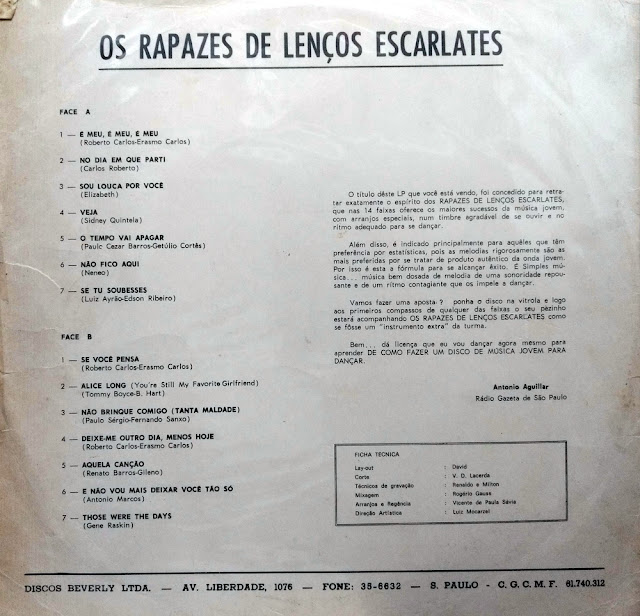 Boa noite, amigos cultos e ocultos! Para não deixar a peteca cair de vez, aqui vai mais uma postagem bem a cara do Toque Musical. Aqui se escuta música com outros olhos, não é mesmo? Muito bem, temos para hoje mais uma curiosidade, o obscuro grupo Os Rapazes de Lenços Escarlates, que a tudo parece se um daqueles grupos de baile dos anos 60. Pelo pouco que eu encontrei sobre este conjunto, dizem que é o organista/tecladista Lafayette. Pode até ser ele mesmo, com uma banda, bem Jovem Guarda. Este disco, ao que consta, foi lançado em 1969 e traz um repertório instrumental com músicas variadas, em ritmo dançante. Vale uma conferida 🙂