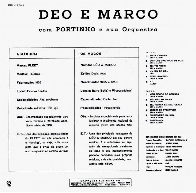 O TM já ofereceu a seus amigos cultos e ocultos vários álbuns de Marku Ribas (pseudônimo de Marco Antônio Ribas, Pirapora, MG, 19/5/1947-Belo Horizonte, MG, 6/4/2013), cantor, compositor, dançarino, percussionista e ativista político, filho de pai negro e mãe descendente de índios caiapós. Dono de um estilo musical peculiar, com diversos elementos da blackmusic, ele inovou ao utilizar o próprio corpo como instrumento de percussão. Em sua voz, harmonias e melodias improvisadas em qualquer ritmo, o seu estilo de cantar e inventar palavras e frases com diferentes sonoridades influenciou e continua a influenciar diferentes gerações de músicos, de estilos variados. Entre eles, Ed Motta, grande admirador de sua obra, que inclusive organizou a compilação “Zamba bem”, lançada em 2007. Pois hoje o TM oferece um disco que hoje tem inestimável valor histórico, pois documenta o início da carreira de Marku Ribas. Ele atuava, desde 1962, como baterista e cantor do grupo Flamingo. Cinco anos mais tarde, 1967, ele transferiu-se para São Paulo junto com o amigo e parceiro Deo. E é justamente quando gravam, para a Continental, então sob a direção artística de Alfredo Borba, seu único LP juntos, este “Deo e Marco”, ficando os arranjos e regências por conta do maestro Antônio Porto Filho, o Portinho. Na capa, eles aparecem ao lado de um avião biplano Fleet, encomendado  especialmente para servir durante a Revolução Constitucionalista de 1932 (Marco, o futuro Marku Ribas, é o que está de pé). Outra curiosidade fica por conta da contracapa, na qual são relacionadas as características do avião e da própria dupla. Nessa época, a Jovem Guarda ainda estava no auge, e era preciso aproveitar a onda. Tanto que as doze faixas do disco, todas de autoria dos próprios intérpretes, seguem o estilo da época, alternando iê-iê-iês e baladas românticas. Mesmo tendo passado despercebido à época de seu lançamento, “Deo e Marco” vale como precioso documento, como diz a contracapa, das “inimagináveis” possibilidades de seus intérpretes, particularmente Marco, quer dizer, Marku Ribas, que depois iria revelar-se um dos músicos mais criativos e inovadores que a música popular brasileira já conheceu em toda a sua história. A conferir, sem falta.