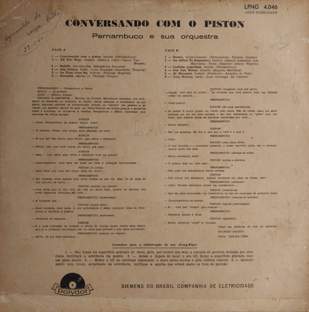 O Toque Musical oferece hoje a seus amigos cultos e ocultos mais um disco na linha dançante, desses que animavam quaisquer  bailes e festas não só em residências como também em salões que não dispunham de música ao vivo. Trata-se de “Conversando com o pistom”, terceiro álbum do maestro, pianista e pistonista Pernambuco (os anteriores foram “Em ritmo de dança” 1 e 2), lançado em 1959 pela Polydor. Ayres da Costa Pessoa, seu nome verdadeiro, nasceu na cidade de Palmares (município pernambucano, obviamente), no dia 27 de fevereiro de 1918, e há poucas informações a respeito dele (não há referência nem mesmo a respeito de seu falecimento). Partiu muito jovem para a então meca dos artistas e capital da República, o Rio de Janeiro, e, em seus primeiros anos na “Cidade Maravilhosa”, foi pistonista da orquestra de Otaviano Romero Monteiro, o Fon-Fon. Mais tarde, trocou o pistom pelo piano, dedicando-se também a arranjos e composições. Um de seus trabalhos autorais mais conhecidos é o samba-canção “Suas mãos”, de parceria com Antônio Maria, que tem várias gravações, destacando-se as de Sylvia Telles e Maysa. No entanto, após oito anos, Pernambuco voltou a soprar seu pistom, o que aliás é frisado no interessante texto de contracapa assinado pelo jornalista e também compositor Ricardo Galeno, um diálogo imaginário entre Pernambuco e o instrumento. Aqui, ele está à frente de sua orquestra (os dois álbuns anteriores foram com seu conjunto), com direito inclusive a duas músicas de autoria dele próprio, à época também lançadas em 78 rpm: a faixa-título e de abertura, o samba “Conversando com o pistom”, e o mambolero “Dorme”, este em parceria com o contracapista do álbum, Ricardo Galeno, interpretado por coral, e regravado mais tarde por Dalva de Oliveira. Além de uma adaptação do próprio Pernambuco para o clássico “Casinha pequenina”, em ritmo de samba, e “Sarambá”, parceria do dançarino Duque com o maestro J. Thomaz (que regia de luvas e… não sabia música!), surgida em 1930. No mais, uma verdadeira seleção de sucessos, com destaque para a presença de dois indiscutíveis e imortais clássicos de Luiz Gonzaga: “Asa branca” (parceria com Humberto Teixeira) e “Vem, morena (com Zé Dantas). E ainda os clássicos internacionais “All the way” (então sucesso de Frank Sinatra), “Babalu” (eterno carro-chefe de Ângela Maria no Brasil), “As time goes by” (surgida em 1931 mas que só se tornou bem conhecida em 1942, com o filme “Casablanca”), “An affair to remember” (tema-título de outro filme famoso, exibido no Brasil como “Tarde demais para esquecer” e “Ai, mouraria” (obra-prima portuguesa, com certeza). Enfim, mais um álbum que é verdadeiro espelho de sua época, representando um período de expressivo fastígio melódico no mundo inteiro, inclusive no Brasil, é claro. É só conferir…