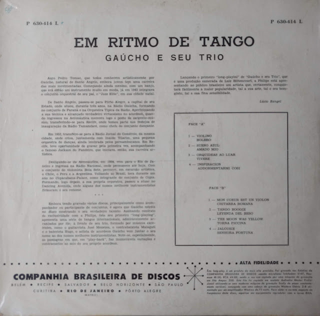 Hoje, o Toque Musical oferece a seus amigos cultos e ocultos um álbum focalizando o tango, estilo musical surgido na região do Rio da Prata, na América do Sul, entre as cidades de Buenos Aires (capital da Argentina) e Montevidéu (capital do Uruguai). A partir do início do século XX, o tango começou a ultrapassar fronteiras, levado por marinheiros franceses a seu país natal. Paris se apaixonou pelo tango, o que fez muitos artistas argentinos e uruguaios viajarem e até se radicarem na “cidade-luz”. Este “Em ritmo de tango”, que hoje oferecemos, foi lançado pela Philips em 1960, e a execução fica por conta do acordeonista Gaúcho, sobre o qual, infelizmente, pouco se sabe. Ele é (ou era) gaúcho mesmo, batizado com o nome de Auro Pedro Tomaz, e nascido na cidade de Santo Ângelo. Seu primeiro instrumento foi o banjo, então na moda, que tocava no conjunto orquestral de seu pai, o Jazz Elite, em 1942. Mais tarde, transferiu-se para a capital do estado, Porto Alegre, e ficou três anos na Rádio Gaúcha, atuando no conjunto de Paraná e na orquestra típica da emissora. Aperfeiçoando sua técnica no acordeom, do qual seria autêntico virtuose, logo que ingressou na Aeronáutica, foi nomeado sargento-músico, depois mudando-se para a capital pernambucana, Recife, onde tomou parte nos festejos de inauguração da Rádio Tamandaré, como chefe do conjunto dançante. De lá, foi para a Rádio Jornal do Commercio, criando uma orquestra de danças, e seu acordeom é inclusive ouvido nos primeiros discos de Jackson do Pandeiro, lançados pela Copacabana entre 1953 e 1955. Em 1955, Gaúcho desliga-se da Aeronáutica e muda-se para o Rio de Janeiro, ingressando na lendária PRE-8, Rádio Nacional, então “a estação das multidões”. Atuou ainda nos conjuntos do violonista Djalma de Andrade, o Bola Sete (com quem excursionou pelo Chile, Peru e Argentina), e do flautista e maestro Copinha. Participou ainda da terceira formação do Trio Surdina, com o violinista Al Quincas e violonista Nestor Campos, e teve orquestra própria, que tocava no Dancing Avenida. Neste “Em ritmo de tango”, produzido por um verdadeiro “cobra”, Luiz Bittencourt, Gaúcho sola seu acordeom à frente de um trio formado por Hugo (bateria), Malaguti (contrabaixo) e o conceituadíssimo Zé Menezes (guitarra). São dezesseis tangos de sucesso internacional, com arranjos do próprio Gaúcho, em oito faixas, duas para cada música. Entre eles, obras-primas como “Jalousie”, “Sueño azul”, “Senhora fortuna” e “Amado mio”, integrando um repertório de muito bom gosto e sensibilidade. Portanto, este é mais um trabalho de qualidade que merece a postagem de hoje de nosso TM.