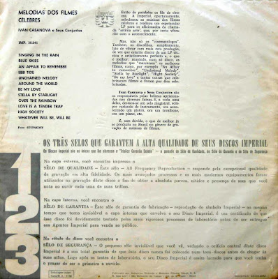 Boa noite, amigo cultos, ocultos e associados! Antes que a terça vire quarta, aqui vai nossa postagem do dia. Hoje trazendo, mais uma vez, Ivan Casanova e Seus Conjuntos. Desta vez apresentado vários temas clássicos do cinema internacional. Um nome de fachada criado para esconder estrategicamente, por questões contratuais, artistas como Walter Wanderley. Muitos afirmam que este foi um codinome adotado por Walter, assim como outros. Porém ao ouvirmos este disco, quem ainda não sabe da história, há de pensar que Ivan Casanova é um saxofonista. Isto porque em quase todas as doze faixas o que mais se destaca é o saxofone. Daí, eu concluo que o tal codinome não se refere necessariamente ao Wanderley. Certamente ele está tocando neste elepê, percebe-se logo pelo estilo ao piano, mas, como dizem, uma andorinha só não faz verão. Havia ali outros grandes nomes que vale também ser citados, mas nessa história só vazou o Wanderley. Taí, um assunto bom para ser comentado aqui. Vamos lá amigos, demonstrem interesse! Quem sabe alguma coisa além, vem cá contar para nós 🙂