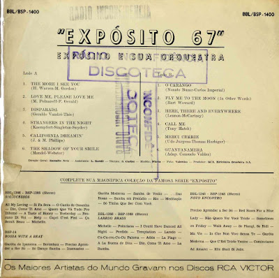 Deixo hoje para vocês outro disco do misterioso Expósito e sua orquestra. Misterioso talvez não seja o termo apropriado, afinal sua figura e sua história já nos foi revelada em outros discos postados aqui. O álbum da vez foi lançado em 1966, obviamente pensando no ano seguinte. Um repertório misto, cheio de sucessos da música pop internacional e também: “O carango”, de Nonato Buzar e Carlos Imperial, sucesso na voz do Simonal e “Disparada”, de Geraldo Vandré e Theo de Barros, clássico de festivais. O disco mantém a excelência musical, contudo, pessoalmente, prefiro os anteriores postados aqui.