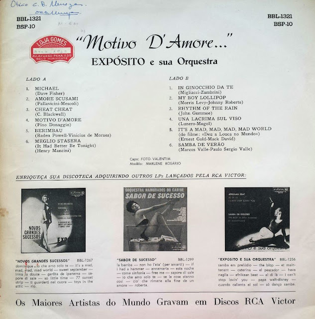 Pois é, e assim temos mais um disco do maestro Expósito em nossas fileiras. Depois de termos postado aqui, pelo menos uns quatro disco dessa maravilhosa orquestra, agora me aparece mais este, “Motivo D’Amore”, outro álbum com um sortido repertório contemplando temas nacionais e internacionais. Como em outros lançamentos da RCA Victor, este também não fica a desejar, exceto pelas informações a respeito de Expósito e Sua Orquestra. Este é um nome que só veio a ser desvendado depois que passamos a postar os seus discos. Foi graças aos amigos cultos que conseguimos desvendar o misterioso Expósito. Segundo informações colhidas nos próprios comentários de postagens, Expósito foi um maestro argentino que esteve no Brasil durante a década de 60 fazendo arranjos e regências para a Orquestra da RCA Victor. Gravou com ‘sua’ orquestra pelo menos uma meia dúzia de lps, todos geniais. Possivelmente, deve ter feito mais coisas para a gravadora, que naquela época produzia muito. Na contracapa deste lp podemos ver três lançamentos da gravadora, sendo que um deles é da Orquestra Namorados do Caribe (disco também já postado aqui no TM). Eu suponho que esta também foi outra contribuição de Expósito. Tudo leva a crer, pelo estilo, pelos arranjos, pela orquestra e pela gravadora. Enfim, estamos aos poucos mapeando todo o circuito musical desse maestro argentino pelo Brasil. Confiram mais este disco, que com certeza é um bom motivo para amar 🙂