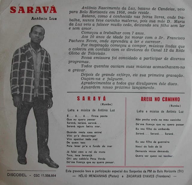Olá amigos cultos e ocultos! Mais uma vez, fazendo jus ao nosso lema, onde dizemos, aqui é um lugar onde se escuta música com outros olhos. Gosto sempre de lembrar isso, principalmente quando trago para o Toque Musical algum ilustre desconhecido. E hoje temos algo assim, um disquinho compacto que estaria totalmente esquecido, não fosse a nossa coragem e vontade de trazê-lo de volta. Por certo, se trata de um tipo de disco e artista que teve sua única chance, ou ainda, a proeza de conseguir gravar um disco, num tempo que isso era coisa difícil. Alías, mais do que gravar, o difícil mesmo era gravar um segundo, ou continuar na carreira. Produções independentes na época de ouro da indústria fonográfica era geralmente capricho daqueles que podiam bancar ou serem bancados por algum mecenas. Ou ainda, aqueles artista que não conseguiram chegar a sombra de uma grande gravadora. Antonio Luz, o Baiano, foi um tipo assim, conseguiu realizar a façanha de gravar duas de suas composições. Conforme nos descreve o texto de contracapa, Antonio Luz foi um baiano que veio para Minas Gerais. Trabalhava em feiras livres na cidade de Belo Horizonte e tinha o hábito de compor canções. Ficou conhecido nas feiras a ponto de ser levado a televisão local, onde se apresentou, mostrando assim a sua música. Conseguiu no inicio dos anos 70 gravar esse compacto pela editora Discobel. Infelizmente, não achei mais nada sobre ele. Penso que vai ser mais fácil alguém dele encontrar essa postagem. Que sirva de registro essa nossa publicação. Confiram as músicas no GTM.