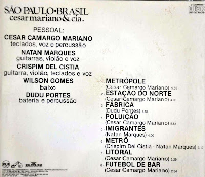 Boa tarde, meus prezados amigos cultos e ocultos! Hoje, logo cedo, escutei uma música vinda de um dos apartamentos do prédio onde moro. Estava alto o som e eu só não fui lá reclamar porque a música era boa, um instrumental que eu logo identifiquei. Era o Cesar Camargo Mariano. Peraí, pensei comigo, eu tenho esse disco! Achei até que já o tivesse postado no blog, mas verifiquei que não. Taí uma boa hora para fazê-lo. É um dos discos de música instrumental que eu mais gosto. É ousado, competente e de altíssima qualidade. Para mim, se iguala ou supera aos melhores do ‘fusion’ internacional. Quer dizer, ‘fusion’ no sentido mais amplo do termo. Foi o segundo disco solo de Cesar Mariano, ou Cesar Camargo Mariano. Um trabalho inspiradíssimo que projeta em nossas mentes as diversas facetas de Sampa. Uma homenagem e tanto! Mas este disco não seria o que é se não tivesse o Cesar Camargo acompanhado pelas feras, Crispim Del Cistia, Natan Marques, Wilson Gomes e Eduardo Portes. Os caras juntos formam uma química muito boa.