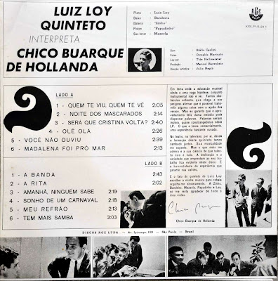 Taí um disquinho bacana, músicos de primeira! Luiz Loy comanda a turma formada por Papudinho (José Lídio Cordeiro), pistom; Mazzola (Renato Menconi), saxofone; Bandeira (João Roberto Martins Bandeira), contrabaixo, e Zinho (José Rafael Daloia), bateria. O quinteto neste álbum interpreta a música do jovem Chico Buarque, que na época despontava como um já grande compositor. Chico também escreve o texto da contracapa. É mesmo interessante notar, este foi o primeiro disco instrumental de músicas do Chico. Não sei se o lp alcançou uma boa vendagem, mas com certeza deve ter sido muito bem aceito por aqueles que o adquiriram. Eu tô adorando 🙂