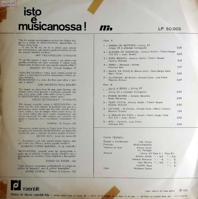 Muito bom dia e ano a todos os amigos cultos e ocultos! Começamos aqui o ano de 2012 com a esperança de continuar levando um pouco mais dessa luz, que é a música popular brasileira, que FOI a produção fonográfica brasileira e que é a parte mais rica da nossa história musical. Começo batendo na mesma tecla, lembrando o quanto o desinteresse de muitos e o oportunismo de poucos levaram a produção fonográfica brasileira ao sucateamento, ao desmantelamento e consequentemente ao esquecimento. Volto a afirmar o quanto anarquismo ‘cibernético’, ‘digital’ ou qualquer outro nome que vocês queiram dar, favoreceu à retomada e resgate do que foi levado embora ou se perdeu na música popular do Brasil ao longo das três últimas décadas. O surgimento de blogs como o Toque Musical, principalmente no Brasil, foi de suma importância, mesmo sendo visto com um grito marginal ou criminoso. Digo isso porque o Brasil foi um dos maiores produtores de discos no mundo! A melhor música popular do mundo está aqui! Aliás, como dizia o Aloysio de Oliveira, está aqui, em Cuba e nos Estados Unidos. A brasileira, para mim, é a melhor porque traz em si elementos genuínos e também os da música cubana e americana. Não é por acaso que todos querem e amam esse produto nacional. Observem que tudo que de bom neste nosso país acaba sendo adquirido e usufruído pelos de fora. Vejam o nosso café, o nosso ouro, a nossa mata… é tudo deles! Daí fica a pergunta, quem vendeu o Brasil? Resumidamente eu diria que foram os burros, os ingênuos encantados com espelhinhos brilhantes trazidos de fora, gente sem visão, sem coração, mas com muita fome de grana! Continuo mantendo a teoria da conspiração fonográfica, ‘trama do esfacelamento da produção fonográfica nacional’, do seu verdadeiro roubo, que tanto prejudicou grande parte dos artistas brasileiros e principalmente o acesso do nosso povo. A MPB deveria ser considerada um patrimônio cultural imaterial brasileiro, se é que isso é possível. É claro que sabemos o quanto é difícil, num país como no nosso, tentar gerenciar toda essa produção, que começa desde de quando o primeiro disco foi gravado por aqui. Não temos o mesmo poder dos americanos, europeus e japoneses, que sempre souberam valorizar seus produtos (e os nossos, claro!). Faltou-nos educação e investimento na cultura em geral. Faltou empenho por parte daqueles que estiveram sempre no poder. Agora, quando temos a oportunidade de rever isso, de mudar um pouco esse quadro, enfrentamos barreiras, que em outras palavras é o mesmo que dizer, estamos comprando de volta e pagando caro por aquilo que vendemos a preço de banana. Um disco, por exemplo, como muitos postados aqui, vocês só tiveram a oportunidade de conhecê-lo porque alguém, como eu, se deu ao trabalho de trazer de volta, de compartilhar e fazê-lo ser ouvido novamente. Podemos observar também que a maior quantidade de blogs que compartilham músicas, se concentram no Brasil e isso, eu creio que não é apenas porque não existe aqui de fato uma lei reguladora, com punições severas. A verdade é que ainda vale a pena manter o ‘anarquismo’ em prol do sucateamento, do resto do tesouro perdido pelas gravadoras, mas guardado com carinho nos lares brasileiros. À medida em que vamos soltando nossos discos, esses vão sendo novamente incorporados à lista de direitos autorais exclusivos. Como um termômetro, se alcança um bom nível de interesse e procura, logo nos será censurado e talvez relançado a preço de dólar. Diante à cruz ou à caldeirinha, melhor é continuarmos pondo nossos discos para rodar. A gente vai pagar mais caro por um cd ou uma faixa no iTunes, mas pelo menos vamos ter certeza de que a nossa música foi preservada, mesmo não tendo mais direito algum sobre ela.