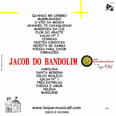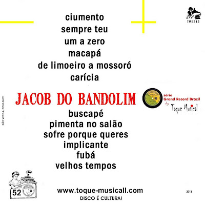 Este é o quinquagésimo-segundo volume do meu, do seu, do nosso Grand Record Brazil, e o quinto dedicado ao riquíssimo legado deixado por esse autêntico mestre das cordas que foi Jacob do Bandolim. E com ele, retomamos a apresentação de registros comerciais de Jacob, uma vez que, como os amigos cultos, ocultos e associados do TM se recordam, no volume anterior tivemos gravações domésticas extraídas dos “saraus” que o mago do bandolim promovia em sua casa no bairro carioca de Jacarepaguá.