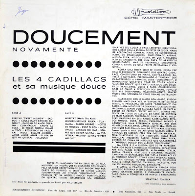 Temos então, “Les 4 Cadillacs – Novamente”, que foi o segundo álbum para um quarteto formado supostamente, por Durval Ferreira na guitarra, Ed Lincoln no piano, Luiz Marinho no contrabaixo e Wilson das Neves na bateria. Segundo uma pesquisa feita pelo nosso saudoso amigo Mauro Caldas, o Zecalouro, em seu ensaio “O Jogo dos Pseudônimos”, apenas no primeiro álbum é que com certeza eram esses mesmos os músicos. Embora não conste na capa, eu acredito que neste segundo lp a turma seja a mesma. Independente de qualquer coisa, o que nos importa de imediato é a música, um estilo e repertório que mantinha o mesmo formato do anterior, música para dançar. Aqui, abrindo um pouco mais o leque, o quarteto interpreta não apenas ‘standards’ da música americana, mas também grandes temas da música francesa, italiana, espanhola, portuguesa, até russsa e latinoamericana, sem se esquecer do Brasil (claro!), através de dois clássicos, “Chove lá fora”, de Tito Madi e “Se todos fossem iguais a você”, de Tom e Vinícius. Confiram no GTM 🙂