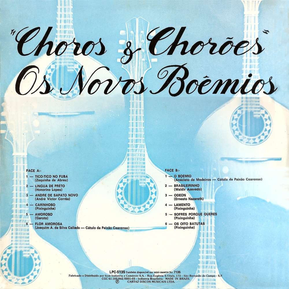Hoje teremos um disco que está funcionando como ‘disco de gaveta’. Isso porque mais uma vez eu não tive tempo para preparar nada. Assim, lanço mão de uma colaboração, um disco enviado recentemente para mim, pela nossa amiga frequentadora Elaine. Eu confesso que não tive tempo de ouvir e conhecer um pouco sobre esse grupo, “Os Novos Boêmios”. A capa também não nos traz nenhuma informação e nem data de lançamento. O álbum foi lançado pelo selo Cartaz. Pelo estilão da capa e outros detalhes, eu diria que o disco foi lançado na década de 80. Contudo, do pouco que estou ouvindo agora, suponho que seja um grupo e uma gravação dos anos 60. Como se pode ver pela estampa, trata-se de um disco de chorinho. O repertório, muito bem pautado, nos traz pérolas de Pixinguinha, Garoto, Catulo da Paixão Cearense, Waldir Azevedo e outro mais… São verdadeiros clássicos do chôro, que sempre vale a pena ouvir de novo e principalmente com outros intérpretes. Vamos conferir?