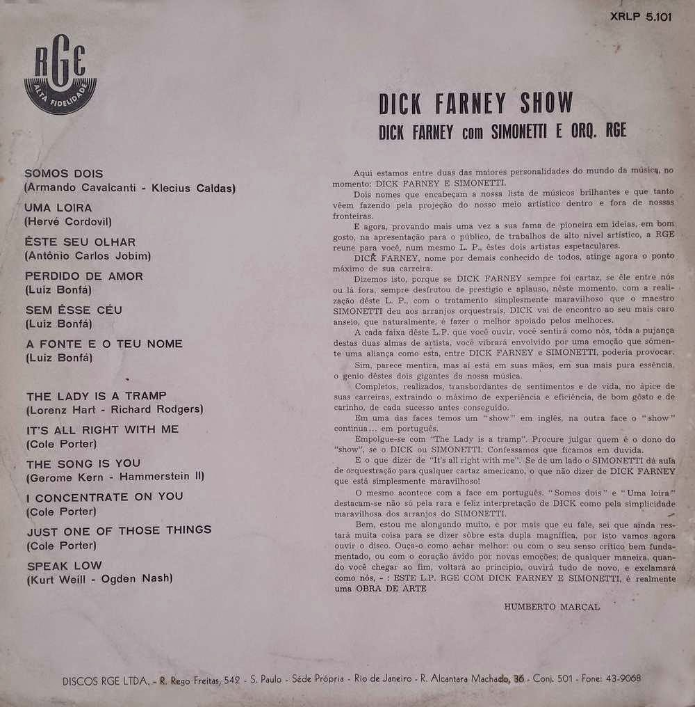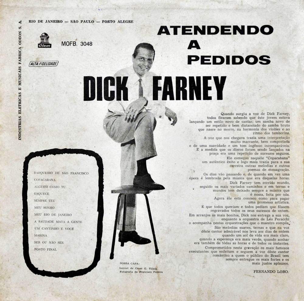 Hoje, por exemplo, vamos de Dick Farney em um belíssimo álbum lançado pela RGE em 1961. Neste lp temos o artista acompanhado pelo maestro italiano Enrico Simonetti, que foi o responsável pelos arranjos e orquestração. Um disco bem dosado e uma escolha de repertório muito equilibrada. De um lado, abrindo o disco temos seis pérolas nacionais, verdadeiros clássicos, como se pode ver logo na contracapa. Do outro lado a coisa se repete, agora com outros clássicos, ‘standard’ da música americana. Um belo trabalho e de nível internacional, não só pelos clássicos, mas pelo talento de Dick Farney somado ao trabalho primoroso desse maestro italiano, que viveu um bom tempo no Brasil, contratado pela RGE. Confiram essa pérola 😉