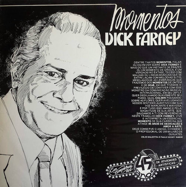 Um dos precursores da bossa nova, e, por tabela, integrado à mesma, Dick Farney (Farnésio Dutra e Silva, Rio de Janeiro, 14/11/1921-São Paulo, 4/8/1987) tem vários de seus álbuns postados aqui no TM, e já foi devidamente focalizado no Grand Record Brazil. É lembrado e cultuado até hoje, e com justiça, por todos que apreciam o importantíssimo legado que deixou como cantor e pianista, aplaudido tanto no Brasil quanto no exterior. Hoje, o TM apresenta a seus amigos cultos, ocultos e associados, mais um disco do notável Dick. Com o título “As duas maneiras de Dick Farney”, o álbum é uma coletânea organizada por Maurício Quadrio, e lançada em 1972 pela Philips/Phonogram, futura Universal Music, com o selo Fontana. É dividido em duas partes distintas: na primeira, “Dick na Broadway”, são apresentadas as gravações que ele fez nos EUA com a orquestra do maestro Paul Baron, em 1954, perfazendo um total de oito faixas, que chegaram ao Brasil em discos de 78 rpm pela antiga Sinter. Os clássicos “Copacabana”, de Braguinha e Alberto Ribeiro, e “Marina”, de Dorival Caymmi, ganham aqui versões bilíngues, com letras em inglês de Jack Lawrence. No restante do programa, seis standards do repertório popular norte-americano, entre eles “How soon”, “For once in your life” e “Tenderly”(que ele próprio registrou pela primeira vez em 1946, lá mesmo nos EUA). A segunda parte deste álbum é denominada “Dick em Ipanema”, e engloba seis faixas que ele registrou em território brasileiro, todas pela Elenco, gravadora criada por Aloysio de Oliveira, cujos trabalhos fonográficos (lançou 60 LPs em quatro anos de atividades) eram extremamente bem produzidos, alguns deles tornando-se até clássicos. Três faixas são do álbum que Dick Farney gravou em 1964, sem título, entre elas um sucesso absoluto na época: “Você” (“Manhã de todo meu”), da vitoriosa parceria Roberto Menescal-Ronaldo Bôscoli, inesquecível dueto de Farney com Norma Bengell, atriz, cineasta e cantora e hoje, com justiça, um dos clássicos da bossa nova. Desse disco de 64 também são as faixas “Inútil paisagem”, e “One for my baby” . As três faixas restantes são de um outro LP, de 1966, denominado “Dick Farney: piano – Orquestra: Gaya”, e são apenas instrumentais, na qual Farney demonstra todo seu virtuosismo de pianista, acompanhado pela orquestra do já veterano maestro Lindolfo Gaya: “Fotografia”, “Valsa de uma cidade” e “And roses.. and roses”, que na verdade é “Das rosas”, de Dorival Caymmi, que ganhou esse título ao receber letra em inglês de Ray Gilbert, gravada por Andy Williams. Enfim, está é mais uma oportunidade que o TM oferece de apreciar um pouco do extraordinário trabalho do inesquecível Dick Farney. Para baixar e ouvir com todo o carinho…