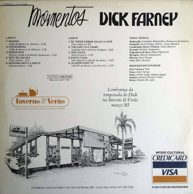 Bom dia, amigos cultos e ocultos! Hoje eu trago para vocês mais um disco da série lançada pelo saudoso restaurante Inverno & Verão, que existiu em Sampa na década de 80. Já falamos dessa casa de show aqui no Toque Musical. Por ela passaram grandes nomes da música nacional e até internacional. E para mim, seu grande mérito foi o registrar e lançar em discos os muitos artistas que por lá estiveram. Com o apoio do Credicard/Visa, o I&V promoveu e lançou de forma quase independente uma dezena de títulos, em discos não comerciais. Ao que sei, esses lps eram oferecidos aos clientes e fornecedores da casa de shows. Por aqui eu já publiquei várias dessas produções e na sequencia temos outro artista, que também sempre esteve presente em nossas postagens, o grande Dick Farney. Embora gravado em estúdio, este lp registra alguns bons momentos do repertório da temporada do artista, em março de 1985. Que eu saiba, essas gravações nunca chegaram a ser lançadas comercialmente. Assim sendo, a oportunidade de conhecer e ouvir o disco é essa. Confiram já, pois o tempo do link é uma baforada 🙂