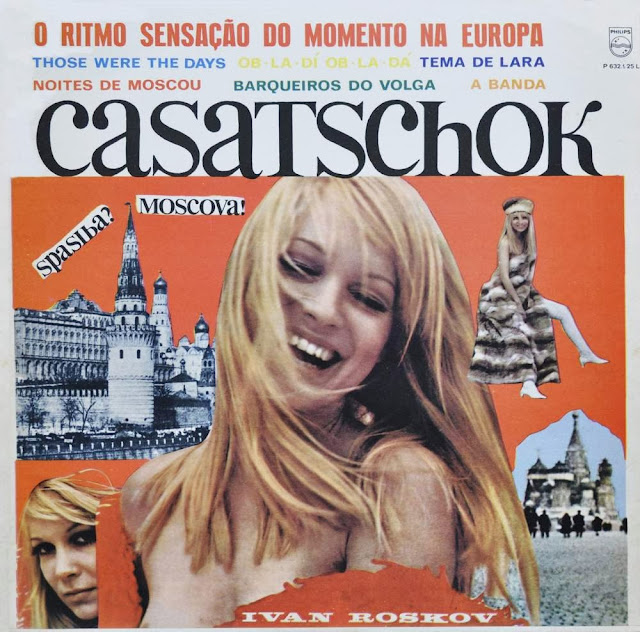 Bom dia a todos, amigos cultos e ocultos! Para uma manhã fria como está agora, para dar aquela esquentadinha, que tal cairmos no embalo do ‘casatschok’? É isso aí… Casatschok foi mais uma ‘onda’, um modismo dançante. Segundo o texto na contracapa, trata-se de ‘uma dança vigorosa e sensual’ que veio da Rússia (vigorosa eu concordo, sensual, só se for pela moça dançando de mini-saia). Trata-se de uma dança típica russa que tentaram revitalizar naquela época como sendo uma nova ‘onda dançante’. Em busca de novidades comerciais, a indústria fonográfica inventava de tudo, inclusive os nomes, como ‘Ivan Roskov”, aqui encarnado no maestro Rogério Duprat. Creio, ao contrário do que muitos pensam, que esses pseudônimos não eram desejo daqueles que os usavam, mas faziam parte do jogo de cena. Se a gravadora queria lançar um determinado tipo de disco, criava um nome apropriado e catava um de seus maestros para dar conta do recado. O Duprat esteve por trás de vários nomes e orquestras fantasmas, que só existiram naquele momento. Eventualmente, diante a um sucesso de vendas, se repetia a dose e novamente o artista ou orquestra ‘X’ voltava a cena, chegando mesmo a ganhar uma identidade quase física. Ivan Roskov, pelo que sei, nasceu e morreu neste disco. “Casatschok”, com tudo, graças ao seu repertório, não fica só naquela de mais um disquinho sem importancia. Ele é no mínimo curioso, graças ao seu repertório e ao seu maestro tropicalista oculto, que dá ao disco extamante a atmosfera tropical, que nada lembra o gelo, a vodka… No máximo uma cutucada na censura da época, que por certo, mesmo com um descomprometido e inocente repertório, que também é variado e internacional, deve ter chamado a atenção. Tá vermelho, tá russo!