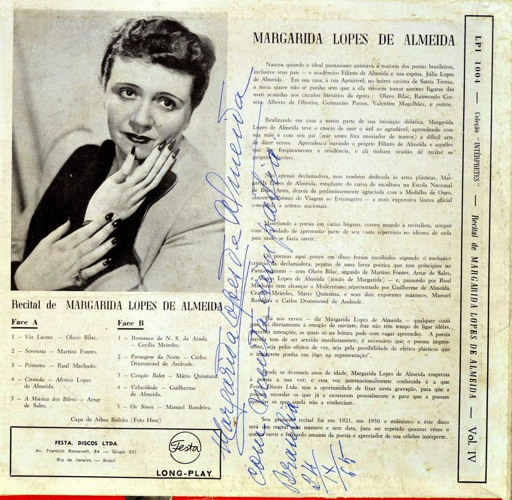 Prezados amigos cultos e ocultos, nosso domingo vai ser mais lírico e poético. Poesia é algo que sempre cai bem por aqui e eu procuro sempre cultivar esse hábito. Hoje eu trago outro álbum produzido pelo selo Festa, do jornalista Irineu Garcia. Como já falamos aqui, o Festa Discos Ltda foi criado com a intenção de promover a poesia, sendo, creio eu, o primeiro selo brasileiro dedicado aos poetas. Eles também lançaram discos de música, álbuns verdadeiramente antológicos. Sua série de discos tem uma importância que vai além da poesia. São registros históricos das vozes, muitas vezes dos próprios poetas. Mas quem melhor, além de seus autores, que os verdadeiros profissionais da interpretação? Como foi o caso, na semana passada, de Paulo Autran. E agora, Margarida Lopes de Almeida, um consagrada artista e declamadora brasileira apresenta aqui dez poetas, dez poemas cujo os estilos vão do Parnasianismo de Olavo Bilac ao Modernismo de Carlos Drummod de Andrade.