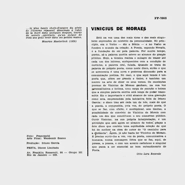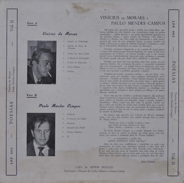 Hoje, o Toque Musical oferece a seus amigos cultos, ocultos e associados um pouco da melhor poesia brasileira. Trata-se de um disco do selo Festa, de Irineu Garcia, jornalista, sonhador, boêmio e autêntico mecenas, que tantas contribuições deu à nossa cultura, inclusive na área musical, com LPs primorosos, tipo “Canção do amor demais”, obra-prima de Elizeth Cardoso, e “Por toda a minha vida”, de Lenita Bruno, ambos já oferecidos a vocês pelo TM. O álbum de hoje, gravado em 1956, é o segundo de uma série da Festa apresentando poetas brasileiros de renome, declamando de viva voz seus poemas. O primeiro volume foi com Manuel Bandeira e Carlos Drummond de Andrade, e este segundo nos traz outros “cobras” do gênero: Vinícius de Moraes (Rio de Janeiro, 19/10/1913-idem, 9/7/1980) e Paulo Mendes Campos (Belo Horizonte, MG, 28/2/1922-Rio de Janeiro, 1/7/1991). Ressalte-se que, nessa época, era costume, no Brasil, lançar discos com recitais de poesia, e um deles, com o rádio-ator Floriano Faissal declamando poemas de Olavo Bilac, lançado em 1957 pela Musidisc, chegou a ser campeão absoluto de vendagem, o que fez a Odeon e a RGE também lançarem títulos explorando esse mercado. Nenhum selo, porém, foi tão dedicado à poesia quanto a Festa, que construiu um catálogo tão impressionante quanto numeroso nessa área. O poetinha Vinícius, claro, dispensa quaisquer apresentações. Neste trabalho, ele nos oferece sete verdadeiras obras-primas vindas de sua inspiração, entre elas os antológicos “Soneto de fidelidade”, “Pátria minha”, “Poética” e “Soneto de separação”. Quanto a Paulo Mendes Campos, creio que muitos o conheceram através das crônicas incluídas nos livros da série “Para gostar de ler”, da Editora Ática, verdadeiros “best-sellers” entre estudantes de ensino fundamental e médio nas décadas de 1970/80, e até hoje em catálogo. Paulo também foi poeta, e seus primeiros livros, por sinal, foram de poesias: “A palavra escrita” (1951) e “O domingo azul do mar” (1958). Aqui, ele declama seis poemas, e apenas um, o soneto “Despede teu pudor”, é de seu livro de estreia, sendo os demais apresentados pela primeira vez. Tudo isso, aliado ao padrão de qualidade da marca Festa, faz deste trabalho, assim como outros da série, um verdadeiro documento histórico, digno de ser apreciado por quem prestigia tudo que há de bom no rico e variado acervo da poesia brasileira. Pura sensibilidade!