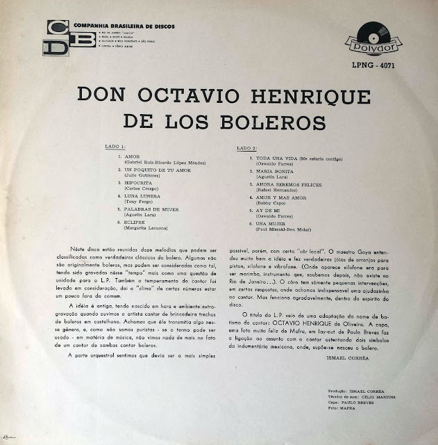 Hoje temos ‘Don Octávio Henrique de los Boleros”, um nome que para quem não conhece, há de passar como mais um título criado pela indústria fonográfica mexicana, aportando por aqui. Mas esse é apenas um título para um disco do cantor Blecaute. Octávio Henrique era o seu nome de batismo. No início dos anos 60, Blecaute passou a ensaiar em seu repertório alguns boleros cantados em espanhol. Seus produtores, na época, acharam interessante transformar o cantor de samba em cantor de boleros. E deram assim vazão a uma ideia que acabou colando. Produziram este lp num clima bem ‘bolerado’, com boleros autênticos e outros adaptados. Coube ao maestro Gaya todos os arranjos, que conseguiu dar ao disco uma característica bem próxima aos originais latinos. Este lp foi lançado pelo selo Polydor em 1961. Depois saiu pelo selo Philips, curiosamente com uma inversão na arte da capa. Eu acredito que este disco da Philips é o que foi lançado no mercado internacional latino americano, principalmente na Colômbia e no Peru, onde o artista chegou a fazer muito sucesso. Confiram…