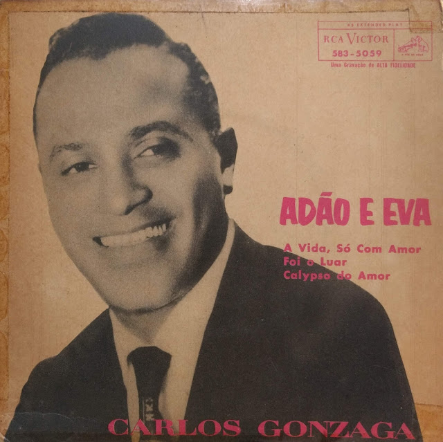 E prossegue o festival de compactos raros do TM. Hoje apresentamos, para deleite de nossos amigos cultos e ocultos, um compacto duplo de 45 rpm (a mesma rotação dos que então saíam nos EUA e em outros países), lançado em 1960 pela RCA Victor, com um dos pioneiros do rock em terras brasileiras: José Gonzaga Ferreira, aliás Carlos Gonzaga. Foi na cidade mineira de Paraisópolis que Carlos Gonzaga veio ao mundo, no dia 10 de fevereiro de 1924. Iniciou sua carreira em meados dos anos 1940, demonstrando, desde então, extrema versatilidade, na interpretação dos mais variados gêneros musicais, como samba, guarânia, bolero, samba-canção, fox, tango e, evidentemente, o rock, no qual se consagrou interpretando versões de hits internacionais do gênero. Seu primeiro disco foi lançado pela RCA Victor em setembro de 1955, um 78 rpm apresentando a guarânia paraguaia “Anahi”, em versão de José Fortuna, e o tango “Perdão de Nossa Senhora”, de Palmeira e Teddy Vieira. Talvez os maiores êxitos de Carlos Gonzaga tenham sido as versões de “Diana”, de Paul Anka, assinada por Fred Jorge (“Não te esqueças, meu amor/ que quem mais te amou fui eu”…), e “BatMasterson”, de Bart Corwin e HavensWray, assinada por Édison Borges (“No velho Oeste ele nasceu”…), esta última o tema principal de um seriado de TV norte-americano do gênero western, no qual o personagem-título, interpretado pelo ator Gene Barry, portava uma perigosa bengala-espingarda, e que alcançou enorme sucesso no início dos anos 1960, inclusive no Brasil. Outros êxitos de Carlos Gonzaga foram: “Rapaz solitário (Lonely boy)”, “Você é meu destino (You are mydestiny)”, “Diabinho (Heylittledevil)”, “Oh! Carol”, “O diário (The diary)”, “Twist outra vez (Let’s twist again)”, “Regresso” (samba-canção de Adelino Moreira), “Ponderosa” (feito para aproveitar o sucesso de outro seriado de TV do gênero western, “Bonanza”), “Juramento de playboy” e outros mais. Fez shows por todo o Brasil e também nos principais países da América Latina, obtendo reconhecimento internacional. Desde 1986, reside na cidade de Santo André, no ABC paulista, e inclusive recebeu, em 2006, o título de Cidadão Andreense. “Adão e Eva” é o nome do compacto duplo de Carlos Gonzaga que o TM nos oferece hoje. A faixa-título e de abertura, claro, é versão de um sucesso de Paul Anka (“Adam andEve”), assinada por Fred Jorge, igualmente lançada em 78 rpm e no LP “És tudo para mim”, do qual também foram pinçadas as duas faixas seguintes do disquinho, “A vida, só com amor”, da misteriosa Marilena, e “Foi o luar (Far, faraway)”, outra versão de Fred Jorge, esta para um hit do cantor-compositor country Don Gibson. Já a faixa de encerramento, “Calipso de amor”, foi lançada originalmente no LP “The bestseller”, e é de autoria do compositor e radialista Serafim Costa Almeida. Enfim, mais uma raridade que o TM entrega a vocês, deste autêntico pioneiro do rock brazuca que é Carlos Gonzaga!