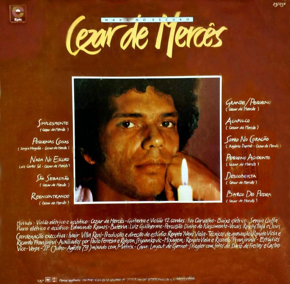 Eu poderia hoje estar postando algo mais condizente com o momento. Mas, sinceramente já estou de saco cheio disso tudo. Prefiro aplicar aqui um som mais legal, um disco que nos leve para outros caminhos mais iluminados. Nada no escuro… Sim, é este o nome do primeiro disco solo do cantor e compositor Cezar de Mercês, um músico que faz parte da história do rock nacional. Foi um dos integrantes do Terço, grande banda dos anos 70, em dois momentos, de 70 a 74 e depois entre 77 e 78. Em 2013 ele voltaria a se reencontrar com a turma, ao lado de Sergio Hinds, Flávio Venturini e Magrão para o lançamento, na época, de um show em DVD. Cezar de Mercês compôs muitas músicas, não apenas par o Terço. Gravaram suas composições artistas como Roberto Carlos, Jane Duboc, Nico Rezende, 14 Bis e outros. Em 1979 lançou através do selo Epic (CBS) este que foi o seu primeiro disco solo, o álbum “Nada no escuro”, nome de uma das onze músicas que compõe o lp, em parceria com Luiz Carlos Sá. Ainda com parceiros ele conta com Sergio Magrão, em “Pequenas coisas” e Rogério Duprat, em “Sopro no coração”. As demais músicas são composições próprias. Este disco chegou a ser relançado há coisa de uns cinco anos atrás, na versão cd, mas novamente hoje volta a ser uma boa raridade.