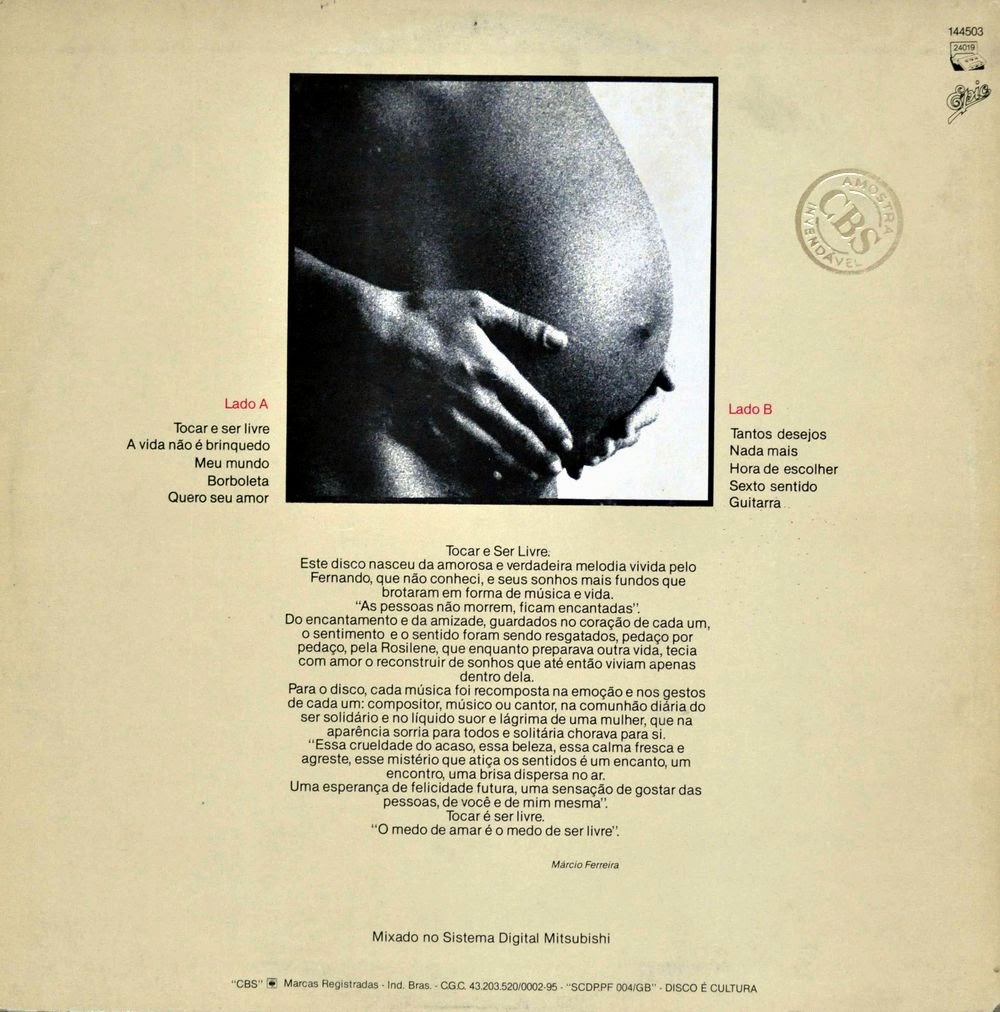 Olá meus prezados, cultos e ocultos! Eis que acho uma hora aqui para a nossa postagem. Esta, em especial, eu estava segurando, tentando conseguir informações sobre o artista. “Tocar e ser livre” foi o único disco do compositor mineiro Fernando Rodrigues. Na verdade um álbum póstumo, lançado, acredito eu, em 1984. Do pouco que sei, Fernando Rodrigues era um músico promissor. Tocou e gravou com diferentes artistas nacionais. Neste lp podemos ouvi-lo tocando ao lado de Afonsinho, Alexandre Lopes, Calos Bala, Claudio Venturini, João Guimarães, Lincoln Cheib, Luiz Avelar, Marcus Viana, Nico Assumpção, Telo Borges… Putz, é gente que não acaba mais… Tá tudo aí, na capa!
