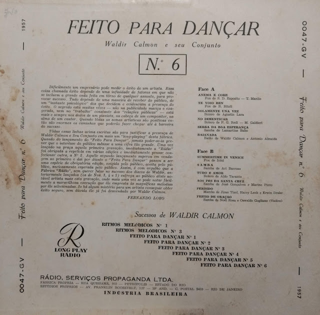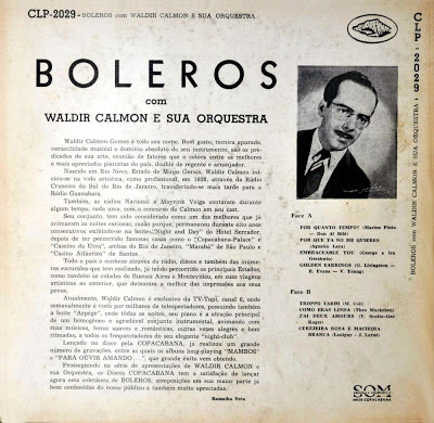 Bom, temos aqui não apenas mais um disco do Waldir Calmon, mas o primeiro disco em formato de lp de 10 polegadas do músico e também o primeiro lançado na América Latina. Até então, os discos comerciais eram aqueles de 78 rpm, com apenas duas músicas, uma de cada lado. Em 1952 surgia o selo Radio e também o disco de 10 polegadas. Este é mais um daqueles álbuns importantes da história fonográfica brasileira. Uma autêntica raridade!