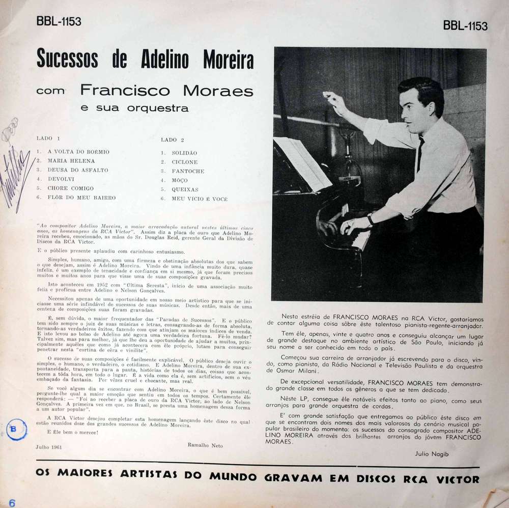 Temos aqui a música do compositor Adelino Moreira, seus maiores sucessos, na interpretação do então jovem maestro, Francisco Moraes e sua orquestra. Taí um álbum bem bacana, onde vale a pena ouvir uma versão instrumental de sucessos de Adelino, sempre eternizados na voz de Nelson Gonçalves. Interessante…