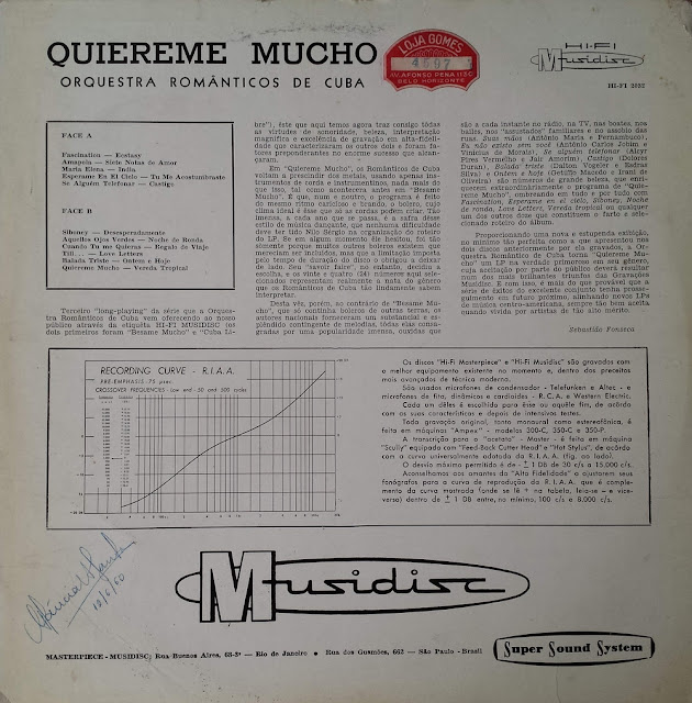 Bom dia, amigos cultos e ocultos! Segue aqui mais um disco da fabulosa Orquestra Românticos de Cuba. E eu que pensava já ter postado aqui mais de uma dúzia de discos dessa orquestra, percebo agora que não chegaram a 4. Então, tenho aqui um bom motivo para postar este disco, “Quiereme Mucho”, terceiro disco dos Românticos de Cuba pela sofisticada Musidisc. Um álbum luxuoso que teve na época duas edições, uma mono hifi e outra em estéreo. Lançado originalmente em 1959, o disco dá sequência aos ritmos latinos, ao bolero principalmente, que está presente nos dois primeiros lps. Desta vez, porém, o repertório inclui autores nacionais como Antônio Carlos Jobim e Vinicius de Moraes, Getúlio Macedo e Irani de Oliveira, Alcyr Pires Vermelho e Jair Amorim, Dalton Vogeler e Esdras Silva e Dolores Duran. Um disco, sem dúvida, perfeito para os amantes de orquestras. Repertório fino! Confiram…