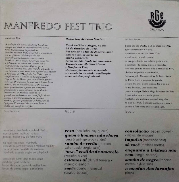 Temos então o instrumentista em um álbum lançado em 1976 pelo selo americano T&M Productions. Este disco nunca saiu no Brasil e ao que me parece foi o primeiro álbum gravado por ele ao se mudar para os ‘States’. Muitos o consideram como sendo o seu disco mais moderno. Um álbum realmente diferente de outros dos seus trabalhos. Em “Brazilian Dorian Dream”, Manfredo vem acompanhado pelo baixista neozelandês Thomas Kini, o baterista e percussionista costa riquenho Alejo “Joe” Poveda e a cantora americana Roberta Davis. Juntos eles fazem um som que bem nos lembra o Sérgio Mendes numa postura mais jazzística. É um disco de “fusion” e dos melhores, com elementos do jazz, do rock e também de suas raízes brasileiras. Foi um álbum muito bem recebido pela crítica e mesmo sendo um disco estrangeiro, nunca chegou a ser relançado no formato cd. Manfredo faleceu em 1999, aos 63 anos, na Flórida (EUA).