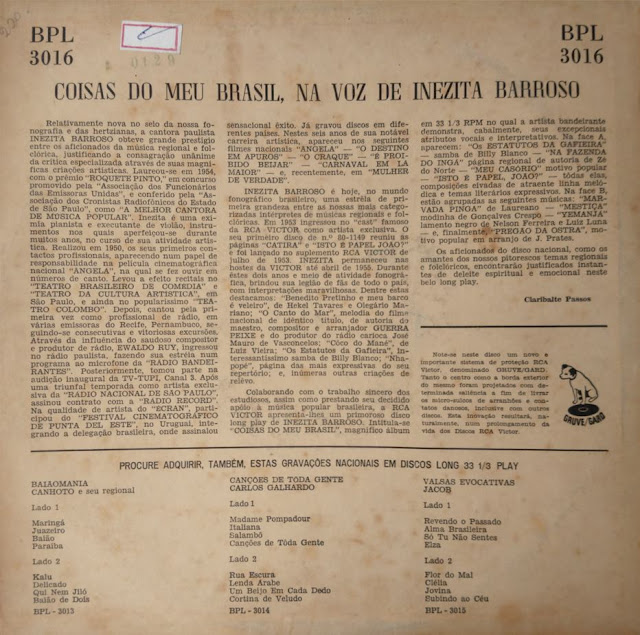 Para fechar com chave de ouro, deixei para hoje essa obra prima, uma raridade que poucos tem hoje a oportunidade de ouvir. Este lp foi o terceiro disco gravado no Brasil pelo selo Copacabana. Não sei se está incluído entre os 300 discos mais importantes da música popular brasiliera, mas se não estiver, merecia. A própria Inezita afirma ser esse seu melhor trabalho.