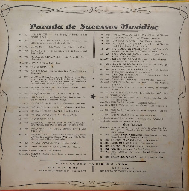 Olá, amigos cultos e ocultos! Aqui vai mais um disquinho que eu comprei do catador de papel. Alguns desses álbuns eu estou tendo, também, o prazer de conhecer e ouvir só agora. É o caso deste lp de 10 polegadas, um dos primeiros lançados pela Musidisc. Trata-se de uma coletânea, obviamente, de artistas da gravadora. Nomes como os que (quase) podemos ler na estampa da capa: Britinho; Léo Peracchi; Nuno Roland; Trio Surdina; Nilo Sérgio (cantando); Djalma Ferreira com Helena de Lima, que só aparece nos créditos do selo, a atriz Renata Fronzi como cantora e ainda a mexicana Elvira Rios. Realmente um show para a época. A qualidade da gravação é muito boa, comparada a de outras gravadoras naquele tempo. Porém, alguns arranhões e estalos são inevitáveis. São marcas de um disco com 58 anos de idade!