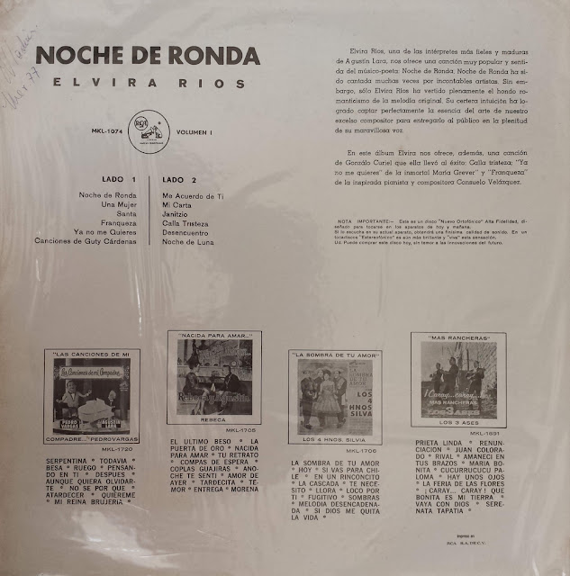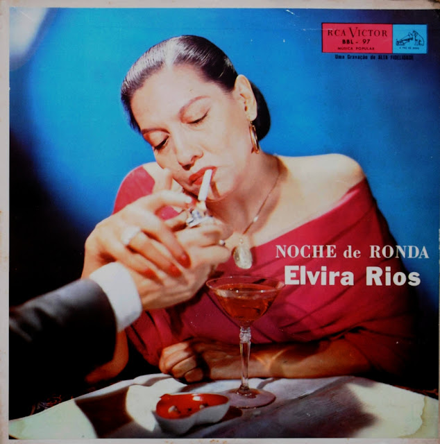 Confesso que tive uma certa dúvida, ao receber este disco para resenhar, se poderia ou não fazê-lo (antes de saber que teríamos uma semana temática, dedicada a música latinoamericana). A maioria esmagadora dos álbuns postados pelo nosso TM é de produção exclusivamente brasileira, e este aqui foi gravado no México. Mas, como diz o ditado, “toda regra tem sua exceção”. Portanto, aqui vai hoje, para nossos amigos cultos, ocultos e associados, um álbum de Elvira Rios, primeira cantora mexicana a obter sucesso internacional na era de ouro dos boleros românticos, lançado em 1957 pela RCA Victor. Foi lá mesmo na cidade do México, a capital do país, que  María Elvira Gallegos Rios veio ao mundo, no dia 16 de novembro de 1913. Desde muito cedo, ela manifestou o vivo desejo de ser  cantora. Assim, bem jovem, e sem receio algum, apresentou-se para um teste perante o poderoso Emílio Azcarraga, diretor da Rádio XEW (um dos embriões do poderoso conglomerado Televisa).  Devidamente aprovada e contratada, ali apresentou-se durante um ano e meio em três programas diários de 15 minutos cada. Em 1937, apareceu pela primeira vez no cinema, cantando no filme mexicano “Esos hombres!”. Manuel Riachi, então assistente de Arthur Hornlow Jr., dos estúdios Paramount, de Hollywood, gostou da voz de Elvira e a indicou a ele, o que possibilitou a Elvira sua primeira aparição como atriz, no filme “Feitiço do trópico (Tropic holiday)”, de 1938, estrelado por Ray Milland e Dorothy Lamour. Em seguida, Elvira apresentou-se na casa noturna La Martinique, de Nova York, conquistando o público com sua voz grave, quente, sincera e dramática, e sua figura misteriosa e desesperadamente romântica, ressaltada por seu tipo de índia. No início de 1939, apresentou-se no luxuoso Miami-Biltimiros, e, ao voltar para Nova York, fez suas primeiras gravações, para a Decca, que marcaram época e ainda hoje são bastante apreciadas, com arranjos de José Morand e Nuno Morales. Em Hollywood, participou ainda dos filmes “No tempo das diligências (Stagecoach)”,  “Cupid rides the range” e “A verdadeira glória (The real glory”), os três de 1939. Ao voltar para o seu México, em gozo de merecidas férias, Elvira teve a satisfação de ser precedida pelos ecos de seus sucessos alcançados nos EUA, um mercado artístico sempre difícil, em especial para os latinos. E sua carreira de grande estrela da canção latino-americana prosseguiu por vários países. Na Argentina, filmou “Vem! Meu coração te chama” (1942) e “Tango vuelve a Paris” (1948). Em seu México de origem, atuou ainda no filme “Murallas de pasión” (1942). É claro que Elvira também ficou bastante conhecida aqui no Brasil, onde foi atração no Cassino da Urca e, na década de 1950, chegou a gravar um LP de dez polegadas na Musidisc, uma das pioneiras do vinil em território tupiniquim. Elvira Rios faleceu em seu México natal no dia 13 de janeiro de 1987, aos 73 anos de idade. Entretanto, sempre terá o carinho daqueles que não entendem a vida sem o romantismo, mesmo que para sofrer as consequências do amor feito de desencontros. Sendo assim, é digna merecedora  da postagem de hoje do TM, com este “Noche de ronda”. A faixa-título e de abertura  tem sido creditada a Maria Tereza Lara, irmã de Agustin Lara, mas na verdade é dele próprio, que a registrou em nome da “hermana”. Ao longo das catorze faixas, acompanhada pela orquestra de Chucho Zarzosa, Elvira nos traz um repertório com belas páginas da música popular latino-americana, compostas por nomes do quilate de Maria Grever (“Ya no me quieres”), Gonzalo Curiel (“Me aguerdo de ti”, “Calla tristeza”, “Noche de luna”), Mário Clavel (“Mi carta”, “Desencuentro”)  e Consuelo Velasquez (“Franqueza”).  E, de Agustin Lara, ela ainda interpreta “Santa” e “Janitzio”. Em suma, este disco é um prato cheio para os fãs da melhor música romântica latino-americana, oferecida pela inesquecível Elvira Rios em brilhantes interpretações. Para ouvir e sonhar…