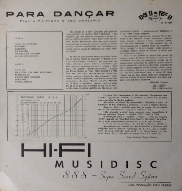 Vamos hoje com mais um disco daquele que foi sem nunca ter sido, ou seja Pierre Kolmann, um pseudônimo artista, encarnado pelo pianista gaúcho Britinho e provavelmente Waldir Calmon e outros, na série de discos dançantes lançados pela Musidisc, de 1957 a 63. Com este álbum completamos a trilogia para dançar de Pierre Kolmann, que era o concorrente direto dos discos do selo Rádio com Waldir Calmon. Esta é uma história polêmica que demonstra bem como eram os bastidores e recursos comerciais da indústria fonográfica brasileira. Pierre Kolmann foi, por certo, em toda a discografia encarnado por pelo menos três famosos pianista.