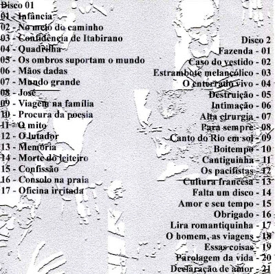 Da coleção ‘dobradinha’ do selo Festa, segue aqui mais um disquinho com dois dos mais populares poetas brasileiros, Drummond e Bandeira. Apesar de ser uma pequena mostra de dois grandes poetas e ficar a sensação de ‘quero-mais’, vale pelo registro histórico.
