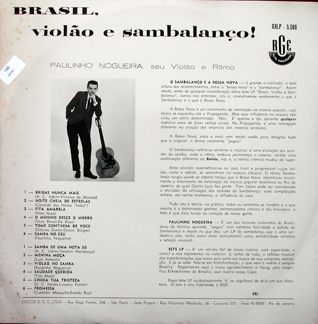 Olá, amigos cultos e ocultos! Temos aqui um disco clássico da era Bossa Nova, Paulinho Nogueira e seu violão. Este lp foi lançado pela RGE em 1960. Nele, como podemos ver pela capa, temos nosso artista interpretando uma série de sambas, entre o moderno e o antigo, mas todos com muito estilo, um estilo próprio que só mesmo um músico tão completo seria capaz de realizar. Disco maravilho, que não pode faltar por aqui…