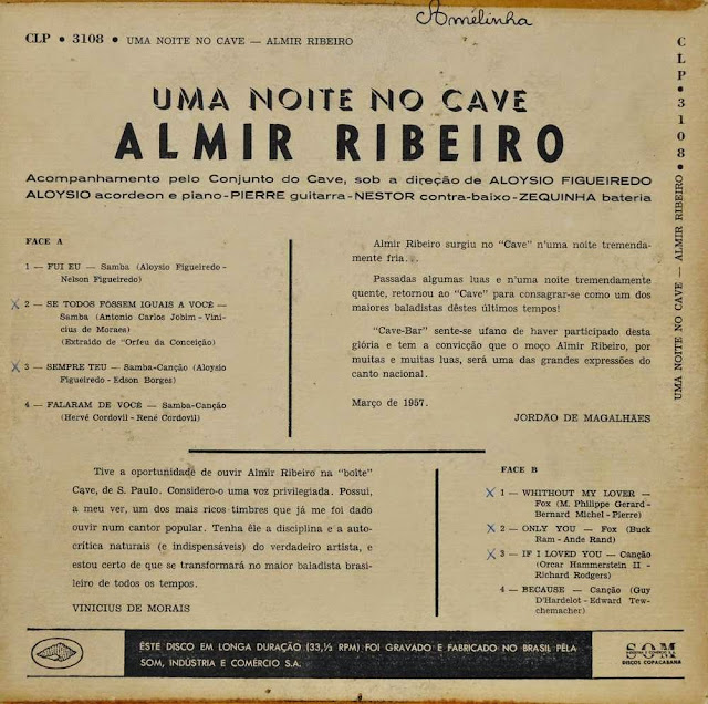 Para nossa terça feira eu tenho aqui o cantor Almir Ribeiro, em disco de 10 polegadas lançado pela Copacabana no ano de 1957. Este artista teve uma carreira curta, interrompida vítima de um afogamento numa praia de Punta Del Este, no Uruguai. Gravou apenas algumas bolachas de 78 rpm e dois lps, sendo um deles o que apresentamos aqui. “Uma noite no Cave” é um disco onde Almir Ribeiro nos apresenta algumas músicas do seu repertório na boate Cave, em São Paulo. De um lado temos quatro temas nacionais e do outro, quatro internacionais. Sob a direção de Aloysio Figueiredo, que também toca piano e acordeom no disco, Almir Ribeiro vem acompanhado por Pierre na guitarra, Zequinha na bateria e Nestor no contrabaixo.. O texto de contracapa apresentando o artista é de Vinícius de Moraes, o qual também comparece, na parceria com Tom Jobim, em “Se todos fossem iguais a você”.