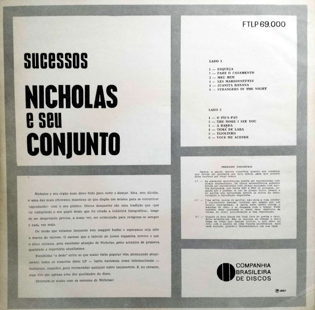 Olá amigos cultos e ocultos! A quem possa interessar eu tenho aqui este lp, lançado pela Companhia Brasileira de Discos, através do selo Fontana, em 1967. Trata-se de Nicholas, um organista ao estilo Lafayete. Sinceramente, eu nunca tinha ouvido falar deste músico e pelas minhas consultas no Google, como sempre nesses casos, a referência só me levou a Mercado Livre, onde se pode encontrar este disco a preços que vão de 15 a 150 reais. Não há muito o que dizer além do que temos de informação na contracapa, que por sua vez não esclarece muita coisa nesse sentido. Para facilitar a coisa, eu o classificaria como mais um disco instrumental na onda Jovem Guarda. Um repertório realmente de sucessos dos anos 60.