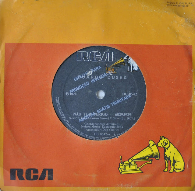 O Toque Musical oferece hoje a seus amigos cultos, ocultos e associados mais um compacto. Desta vez, é um single de início de carreira de um irreverente ator, cantor e compositor: Eduardo Dussek. Batizado com o nome de Eduardo Gabor Dusek, nosso focalizado nasceu no Rio de Janeiro, no comecinho do ano de 1958, ou seja, a primeiro de janeiro. Começou sua carreira artística na adolescência, aos quinze anos, como pianista de peças teatrais, ocasião em que também estudava na Escola Nacional de Música. Mais tarde, passou a compor suas próprias músicas e montou uma banda, devidamente apadrinhada por Gilberto Gil. Em geral, as composições musicais do então Eduardo Dusek aliam sátira e bom humor. Sua estreia em disco deu-se em 1975, ao interpretar “Ela não sabia nada (Piccadilly rock)”, parte da trilha sonora da novela “Bravo!”, da TV Globo, assinando-se a princípio como Duardo Dusek. Já com músicas gravadas por nomes de peso da MPB (como, por exemplo, “Seu tipo”, na voz de Ney Matogrosso, e “Folia no matagal”, por Maria Alcina, mais tarde regravada por Ney e por ele mesmo), revelou-se para o grande público em 1980, no Festival de MPB da Globo, interpretando “Nostradamus”, de sua autoria, cantando e tocando piano de fraque, asas e ceroula branca! Ainda nesse ano, gravou seu primeiro álbum-solo, “Olhar brasileiro”. Mas o estouro definitivo aconteceria em fins de 1982, quando gravou o LP “Cantando no banheiro”, no qual se destacaram os hits “Barrados no baile”, “Rock da cachorra” e a faixa-título. Entre outros sucessos, destacam-se: “Brega-chique – O vento levou black” (mais conhecida por “Doméstica”), “Cabelos negros”, “Eu velejava em você”, “Amor e bombas” (que tocava na abertura de outra novela global, “Bebê a bordo”) e “Aventura”. Em 1989, atuou no musical “Loja de horrores”, no papel de um dentista. Seus trabalhos em televisão foram muitos, particularmente no especial infantil “Plunct plact zuuuum” (Globo, 1983), no papel de um professor de Matemática, e em novelas, como “Xica da Silva” (Manchete, 1996, na qual fez o Capitão-Mor Emanuel Gonçalo). Na Globo, interpretou a si próprio nas novelas “As filhas da mãe” (2001), “Celebridade” (2004), “Tititi” (segunda versão, 2010) e no seriado humorístico “Sob nova direção”. Também fez personagens fictícios em outras produções da emissora. Quando este comentário estava sendo redigido, estava no ar em “I love Paraisópolis” (2015), interpretando o personagem Armandinho. No cinema, atou em “Federal” (2010) e “Os penetras” (2012). Sua discografia como intérprete abrange sete álbuns-solo, gravados entre 1980 e 2011, e o coletivo “Sassaricando – E o Rio inventou a marchinha” (2006), trilha sonora do musical teatral de mesmo nome.
