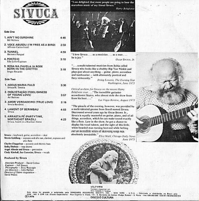 Boa tarde, prezados amigos cultos e ocultos! Entre os tantos discos do Sivuca que eu já postei aqui no nosso Toque Musical, este é mais que não podia faltar. Belíssimo trabalho de Sivuca gravado e lançado nos Estados Unidos, em 1973. Nesta época, Sivuca estava morando em Nova York, gravando muito e trabalhando com o ator e cantor Herry Belafonte. surgiu então a oportunidade de gravar este disco pelo selo Vanguard. No mesmo ano também lançaria outro, ao vivo, o ‘Live in from Village Gate”. Todos os dois lps vieram a ser lançados também no Brasil no ano seguinte, 1974. Neste disco Sivuca toca acompanhado por músicos americanos, o que dá ao trabalho uma atmosfera meio jazzística, ou ainda bem aos moldes de outro brasileiro, o Sérgio Mendes. O repertório é fino, com uma seleção que nos traz dez faixas com músicas, entre essas, também autorais e algumas até bem conhecida do público. Para o meu gosto pessoal, este é um dos discos do Sivuca que eu mais aprecio e que tive a felicidade de ganhar o lp do meu amigo Fáres. Mais que nunca, este é um que não podia mesmo faltar aqui 😉