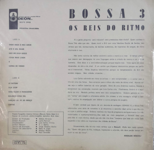 O TM oferece hoje a seus amigos cultos, ocultos e associados um álbum de música instrumental brasileira da melhor qualidade, com o conjunto Bossa 3, que os estudiosos consideram o primeiro grupo instrumental da bossa nova. O Bossa 3 foi criado no início dos anos 1960 pelo pianista e compositor Luiz Carlos Vinhas (Rio de Janeiro, 19/5/1940-idem, 22/8/2001), e, em sua primeira formação, estavam ainda o contrabaixista Tião Neto e o baterista Edison Machado. As primeiras apresentações do trio aconteceram nas boates do Beco das Garrafas, em Copacabana, acompanhando os bailarinos Lennie Dale, Joe Benett e Martha Botelho. Com eles, viajaram aos EUA para se apresentar no “Ed Sullivan Show”, então um dos programas de maior audiência da televisão norte-americana. Após gravarem três álbuns e realizarem uma série de apresentações em clubes de jazz novaiorquinos, Luiz Carlos Vinhas foi o único que resolveu voltar para o Brasil. Aqui chegando, reorganizou o Bossa 3, agora com Octávio Bailly Júnior no contrabaixo e Ronie Mesquita na bateria. A nova formação gravou mais cinco álbuns, sendo um deles com Pery Ribeiro e outros dois com o mesmo intérprete, mais Leny Andrade, sob o nome de Gemini V. Após realizar uma turnê no México, da qual resultou um LP ao vivo, o Bossa 3 se dissolveu, e só voltaria à cena em 2000, para tocar com a cantora Wanda Sá, e desta vez com o baterista João Cortez e o contrabaixista Tião Neto. Foi a última formação do grupo, desfeito definitivamente com a morte de Luiz Carlos Vinhas, em 2001, aos 61 anos, de parada cárdio-respiratória. “Os reis do ritmo”, que o TM nos oferece hoje, foi lançado pela Odeon em 1966, com o Bossa 3 já reformulado, isto é, com o baterista Ronnie Mesquita e o contrabaixista Octávio Bailly Júnior, acompanhando Luiz Carlos Vinhas, pianista e fundador do grupo. Sob a batuta de Mílton Miranda na direção de produção, e do maestro Lírio Panicalli na direção musical, e com excelentes arranjos do próprio Vinhas, o Bossa 3 está em plena forma, num repertório que mistura sambas clássicos (“Não me diga adeus”, “Exaltação à Mangueira”), standards da bossa nova (“Onde anda o meu amor?”, “Até o sol raiar”, “Coisa mais linda”, “Samba de verão”, “Balanço Zona Sul”, “Silk stop”) e trabalhos autorais do próprio Vinhas (“É”, “Le Bateau”, “Recado ao pé do berço”), que na última faixa, “Cartaz”, da parceria Roberto Menescal-Ronaldo Bôscoli (este também escreveu o texto de contracapa do disco) chega até mesmo a cantar! Tudo isso em um trabalho primoroso, com o invejável padrão técnico que a Odeon então imprimia às suas produções discográficas. É só ouvir e confirmar! E mais:brevemente estaremos apresentando mais um álbum de Luiz Carlos Vinhas. Aguardem…